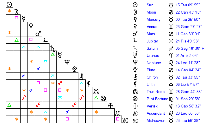 | Sun | 15 Taurus 10 | 16 Taurus 25 | 18 Leo 58 |