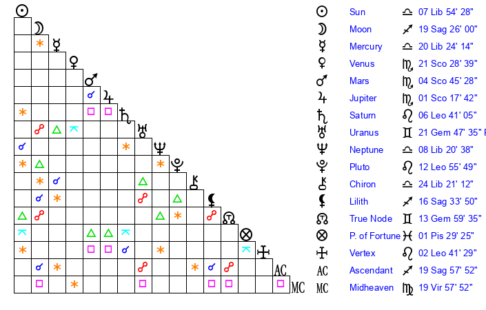 | Sun | 7 Libra 54 | 8 Libra 46 | 27 Sagittarius 12 |
