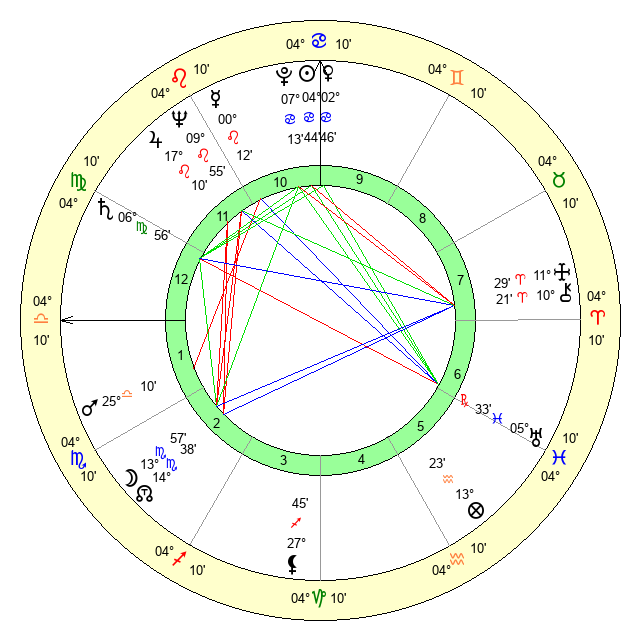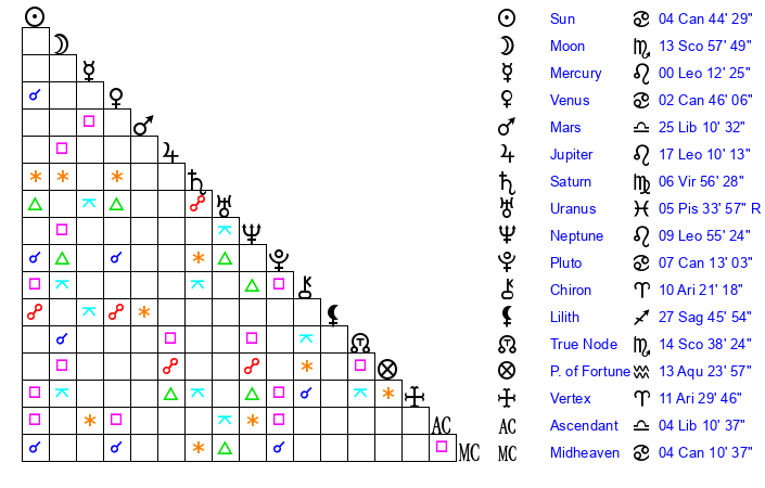 | Moon | 13 Scorpio 59 | 22 Cancer 20 | 16 Virgo 58 |
