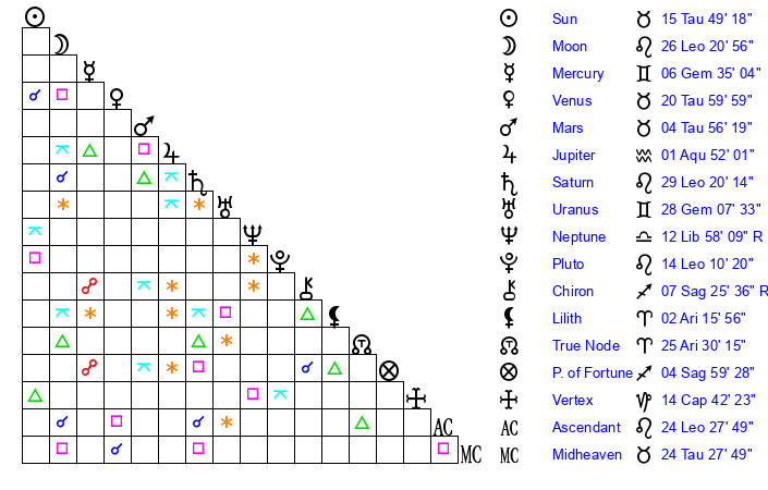 | Mars | 4 Taurus 57 | 8 Leo 16 | 28 Gemini 58 |