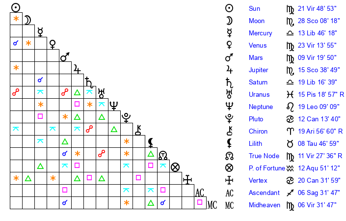 | Saturn | 19 Libra 51 | 28 Pisces 49 | 1 Scorpio 5 |