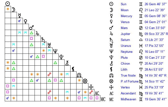| Sun | 26 Gemini 46 | 28 Gemini 4 | 4 Libra 54 |