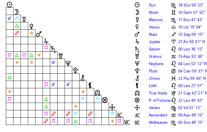 | Sun | 18 Scorpio 59 | 19 Scorpio 33 | 9 Pisces 33 |