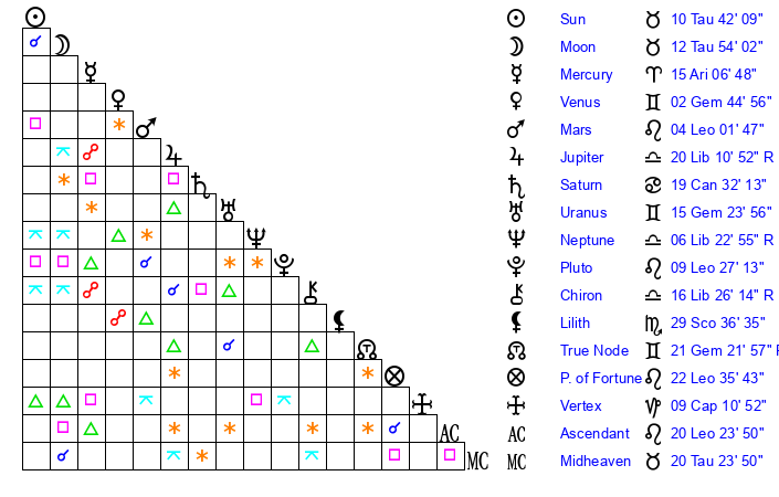 | Moon | 12 Taurus 52 | 5 Cancer 46 | 29 Pisces 23 |