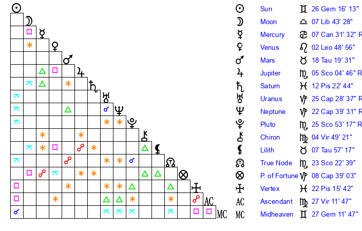 Moon | 7 Libra 44 | 12 Pisces 43 | 1 Sagittarius 6 |