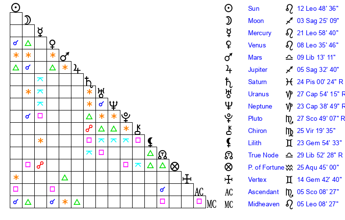 Mercury | 21 Leo 59 | 5 Leo 52 | 8 Libra 12 |
