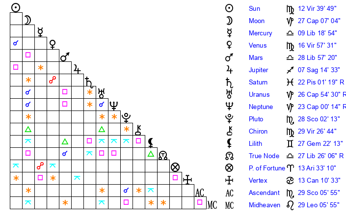 Venus | 16 Virgo 58 | 13 Leo 13 | 24 Libra 16 |