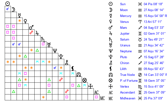 Mercury | 15 Aquarius 55 | 15 Pisces 11 | 1 Pisces 50 |