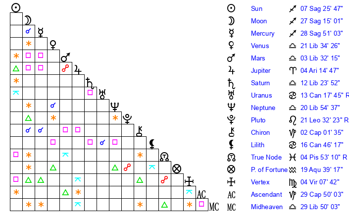 | Neptune | 20 Libra 54 | 27 Pisces 8 | 21 Libra 36 |