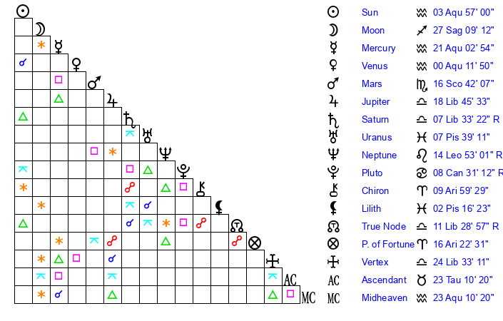 | Moon | 27 Sagittarius 3 | 6 Sagittarius 16 | 28 Virgo 42 |