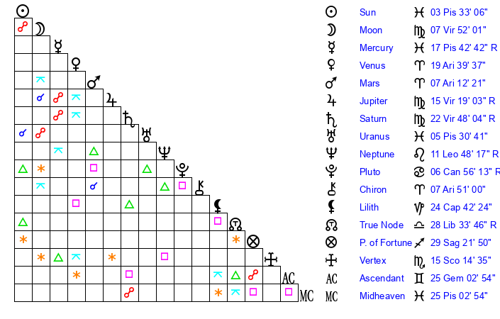 | Mercury | 17 Pisces 42 | 15 Pisces 11 | 9 Cancer 0 |