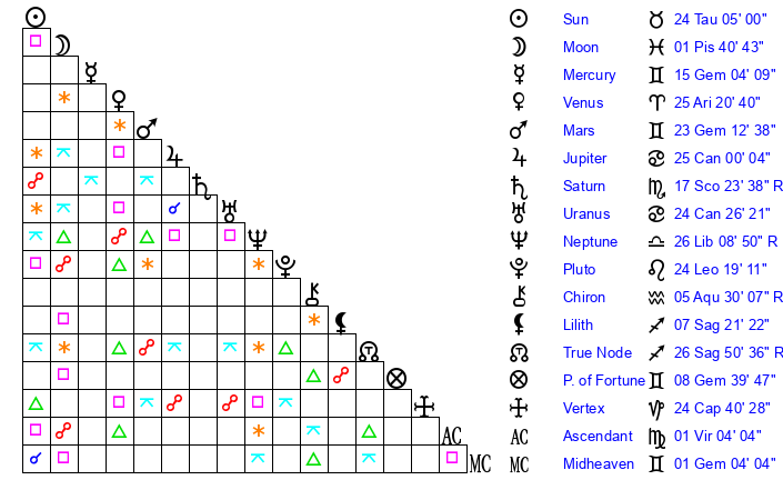 | Saturn | 17 Scorpio 56 | 29 Pisces 8 | 15 Scorpio 2 |