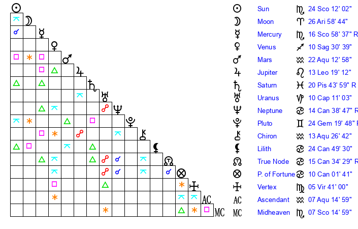 | Sun | 24 Scorpio 12 | 25 Scorpio 36 | 23 Pisces 44 |