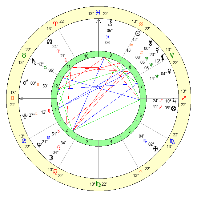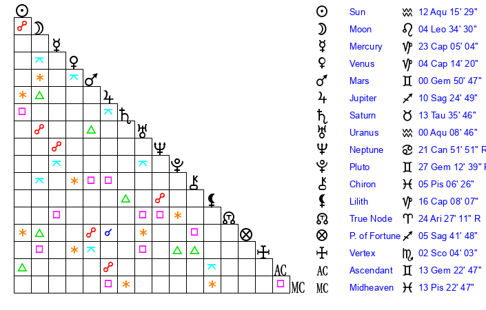 | Sun | 12 Aquarius 15 | 13 Aquarius 51 | 3 Gemini 50 |