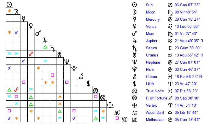 | Sun | 6 Cancer 7 | 7 Cancer 15 | 23 Libra 28 |