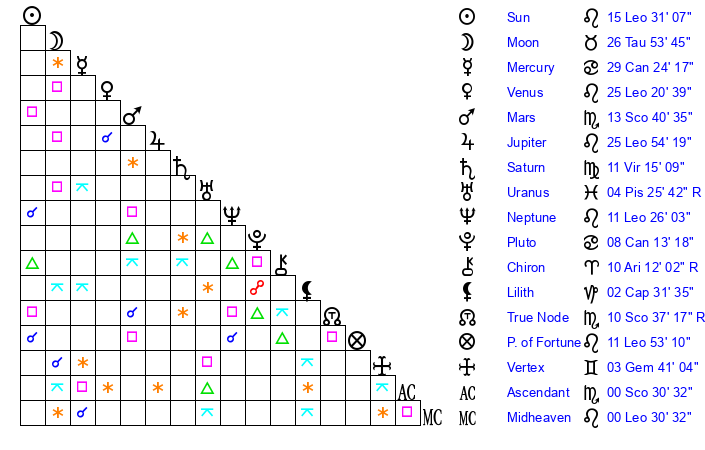 | Neptune | 11 Leo 26 | 1 Aries 51 | 13 Leo 45 |