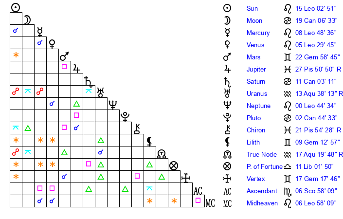 | Neptune | 0 Leo 45 | 1 Aries 51 | 2 Leo 33 |