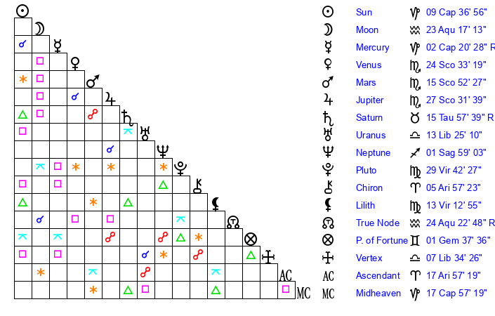 | Sun | 9 Capricorn 36 | 10 Capricorn 16 | 5 Pisces 26 |