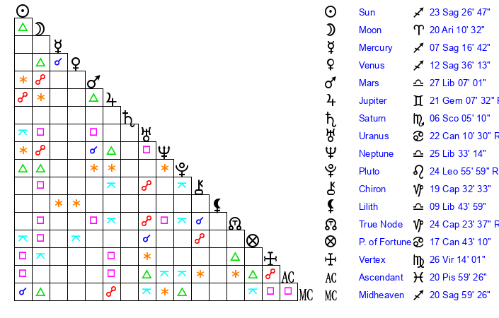 | Sun | 23 Sagittarius 26 | 24 Sagittarius 13 | 5 Pisces 33 |