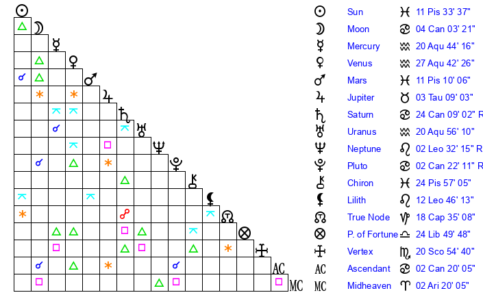 | Mars | 11 Pisces 10 | 17 Cancer 17 | 2 Gemini 44 |