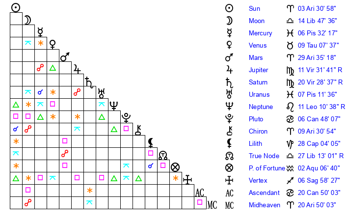 | Sun | 3 Aries 31 | 4 Aries 18 | 14 Cancer 2 |