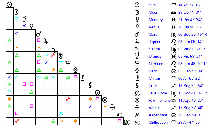 | Sun | 14 Aries 37 | 15 Aries 10 | 25 Cancer 43 |