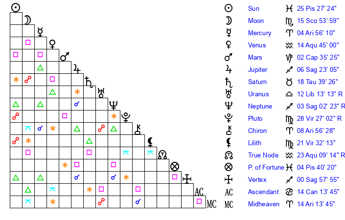 Moon | 15 Scorpio 50 | 22 Libra 44 | 9 Scorpio 41 |