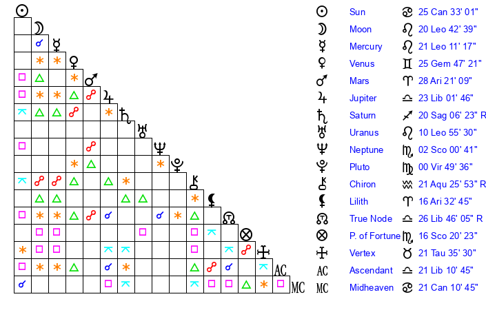 | Sun | 25 Cancer 33 | 26 Cancer 19 | 0 Libra 9 |