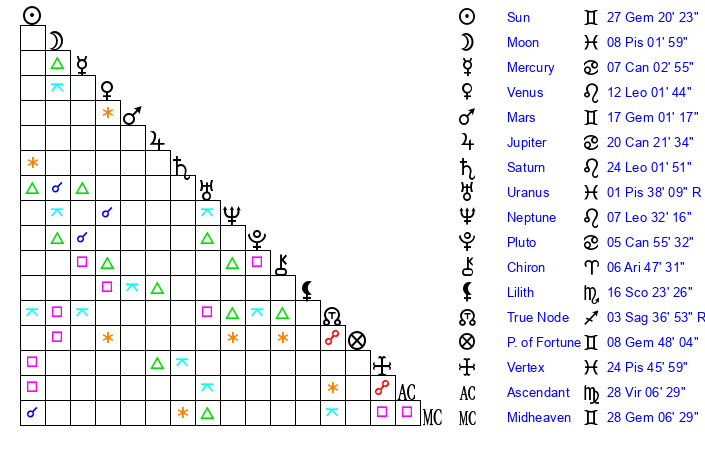 | Sun | 27 Gemini 20 | 28 Gemini 40 | 9 Libra 25 |