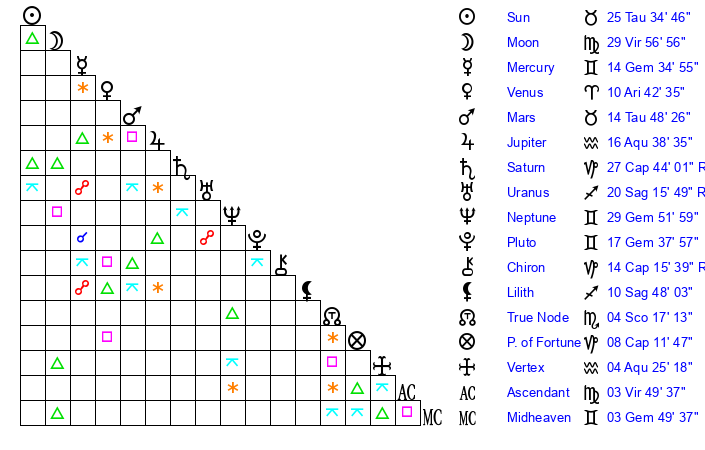 | Pluto | 17 Gemini 39 | 3 Aquarius 46 | 19 Gemini 42 |