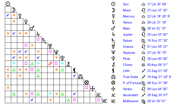 | Sun | 17 Libra 36 | 18 Libra 38 | 28 Sagittarius 2 |