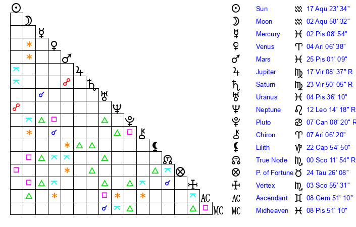 | Sun | 17 Aquarius 23 | 18 Aquarius 9 | 0 Gemini 4 |