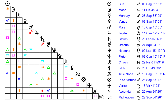 | Sun | 5 Sagittarius 40 | 6 Sagittarius 43 | 24 Pisces 4 |
