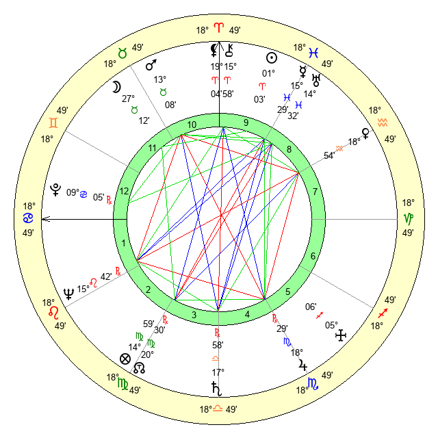 | Sun | 1 Aries 3 | 2 Aries 19 | 9 Cancer 46 |