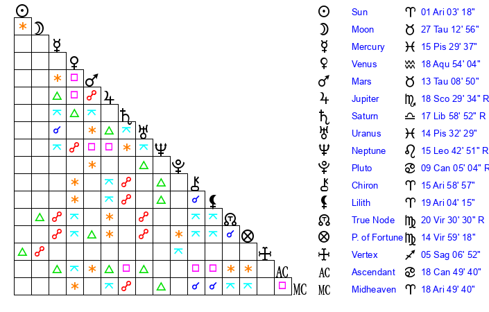 | Sun | 1 Aries 3 | 2 Aries 19 | 9 Cancer 46 |