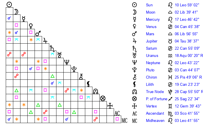 | Neptune | 2 Leo 44 | 1 Aries 56 | 4 Leo 51 |