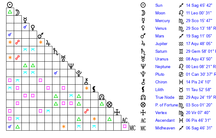 | Sun | 14 Sagittarius 46 | 15 Sagittarius 50 | 6 Aries 56 |