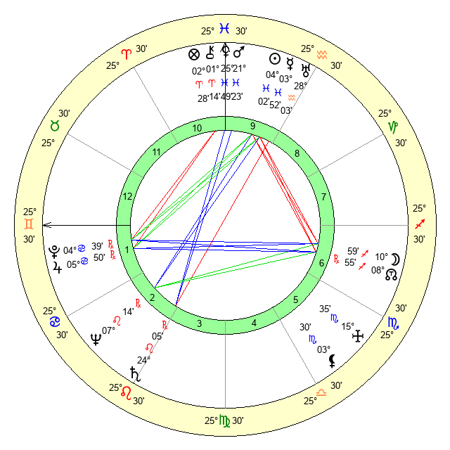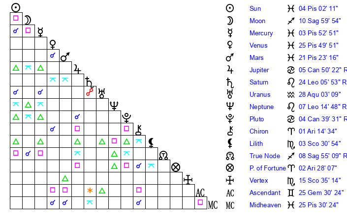 | Sun | 4 Pisces 2 | 5 Pisces 20 | 17 Gemini 47 |