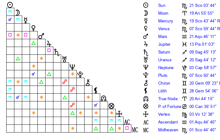 Sun | 21 Scorpio 4 | 21 Scorpio 51 | 29 Sagittarius 35 |