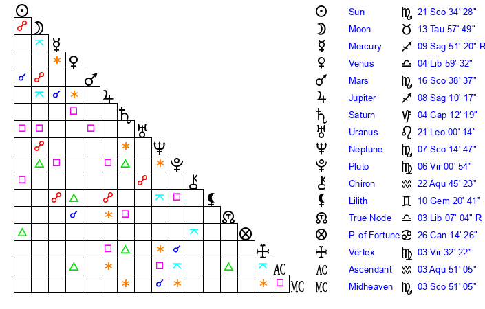 Moon | 13 Taurus 54 | 6 Taurus 21 | 21 Virgo 44 |