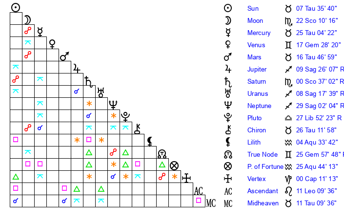 Moon | 22 Scorpio 4 | 17 Taurus 40 | 24 Taurus 54 |