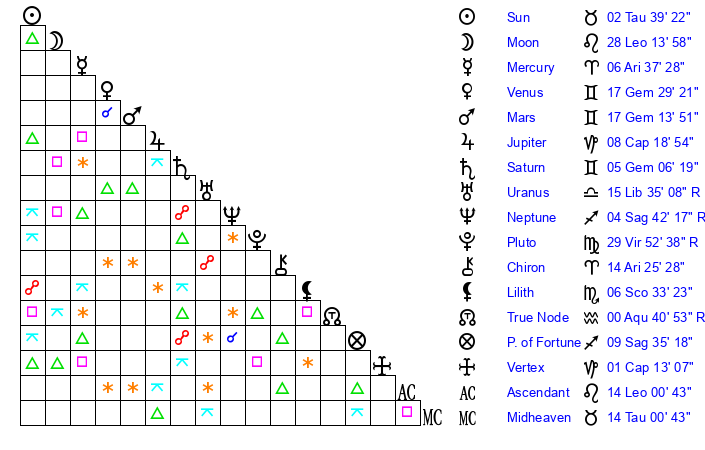 | Moon | 28 Leo 14 | 22 Aquarius 59 | 6 Leo 48 |