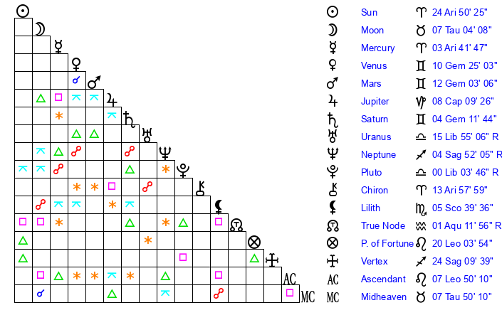 | Sun | 24 Aries 50 | 25 Aries 0 | 16 Gemini 3 |