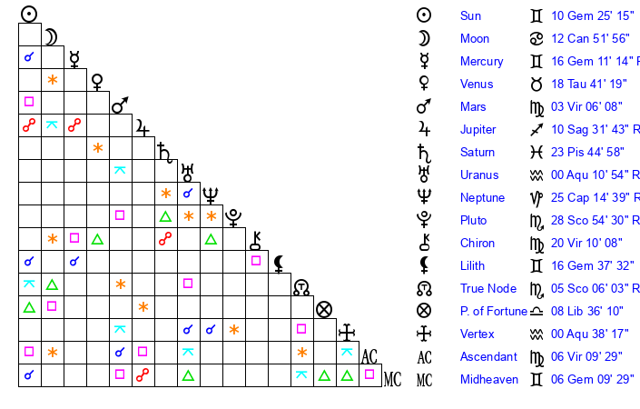 | Jupiter | 10 Sagittarius 23 | 28 Gemini 5 | 6 Sagittarius 56 |
