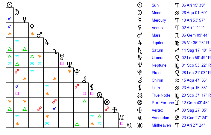 | Moon | 25 Aquarius 55 | 12 Pisces 58 | 21 Leo 43 |