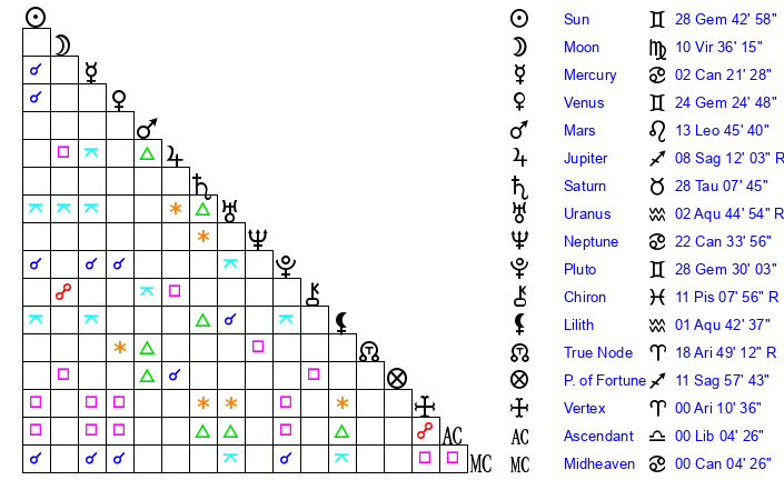 | Sun | 28 Gemini 43 | 29 Gemini 23 | 17 Libra 45 |