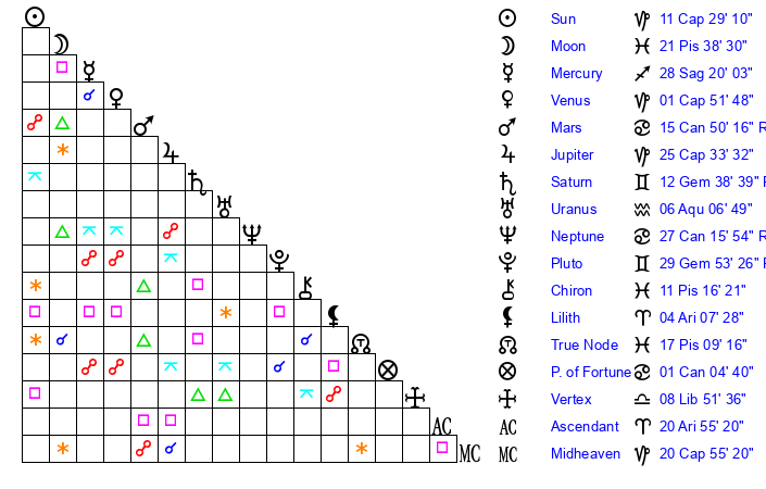 | Mercury | 28 Sagittarius 20 | 1 Capricorn 16 | 11 Aries 53 |