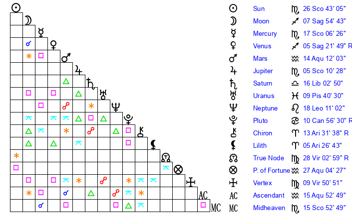 | Sun | 26 Scorpio 43 | 27 Scorpio 44 | 11 Pisces 13 |
