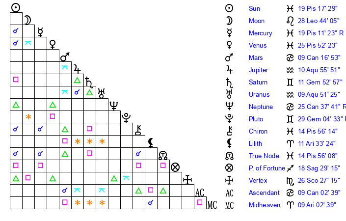 | Sun | 19 Pisces 17 | 20 Pisces 22 | 7 Cancer 4 |