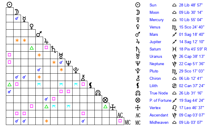 Sun | 28 Libra 49 | 29 Libra 47 | 27 Scorpio 54 |